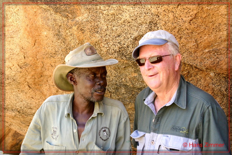 6. Tag, 5. Mai Ein weiter Weg von Oshakati nach Rundu. Mittagspause in der Minenstadt Tsumeb. Die Schachtanlage liegt still. Alles gammelt vor sich hin. Kein Mineralienhändler ist zu sehen. Klaus fragt einen Polizisten danach, aber der weis auch nichts. Im Tsumeb Hotel, wo wir Pause machen, sind an der Rezeption einige mickerige Stücke ausgestellt. Das ist alles. Klaus fährt mit uns noch nach Grootfontein ( Die große Quelle )zum Hoba Meteoriten. Er ist der größte Meteorit der Welt. Fast 3 Meter lang, bis zu 1 Meter dick und 50 Tonnen schwer. Er besteht aus 82,4 % Eisen, 16,4 % Nickel und noch einigen anderen Spurenelementen. Nun nach Rundu, zur Nkwasi Lodge, nicht in die Stadt, sondern außerhalb. Ein Hinweis kommt zur Nkwasi Lodge, ein sandiger Weg, eigentlich nichts für einen Bus. Klaus war hier auch noch nicht, also immer weiter. Es dämmert schon, plötzlich einige Schwarze auf dem Weg und winken. Klaus befragt sich und wir müssen wieder 100 Meter zurück. Auf einer erhöhten Stelle soll der Bus abgestellt werden, aber wo geht es weiter? Klaus klärt uns auf: Der Weg zur Lodge ist nicht befahrbar, weil das Wasser noch zu hoch ist. Vor uns ist der große Fluss Okavango, ca. 300 – 400 Meter breit, der hier die Grenze zu Angola bildet, hier liegt ein Motorboot und ein zusammen gebauter provisorischer „Katamaran", den sollen wir zur Überfahrt benutzen. Das Wasser ist ganz ruhig und so sind wir in 10 Minuten am Ziel. Der Okawango ist einer der großen Flüsse, die nicht ins Meer fließen, sondern als riesiges Delta in der Kalahari versickern. Zur Zeit der kriegerischen Auseinandersetzungen wurde hier alles Wild abgeschossen. Auch die Lodge hatte in dieser Zeit keine Gäste. Die Besitzer konnten aber nicht die Lodge verlassen, weil sonst alles zerstört worden wäre. Nun soll so langsam alles wieder aufwärts gehen. Die Übernachtungsräume sind sehr rustikal, Gerda wollte schon wieder ausziehen, weil ein grüner Frosch in ihrer Behausung war. Nachts gab es auch kein Licht, weil der Strom vom Generator kam, und der wurde in der Nacht abgestellt. Es war aber ein Öllampe vorhanden, aber wer guckt schon danach? Wir sind doch nur elektrisch Licht gewohnt. Das Essen war aber gut. Und wir bekamen auch noch eine folkloristische Schau geboten.